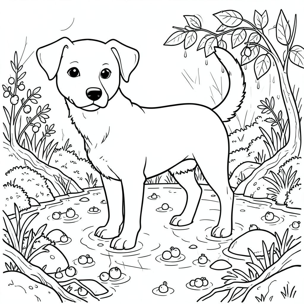 solo, chủ đề đơn, một đầu, hai mắt, hai tai, bốn chân, một đuôi, tỷ lệ tự nhiên, quy mô thích hợp trong môi trường, đúng giải phẫu, chó, đầm lầy nam việt quất, ngập lụt, quả mọng, nổi, nước, ướt, rêu, đá, rễ, ánh sáng mặt trời, trang màu, nghệ thuật đường, nền trắng, solo, chủ đề đơn, đúng về mặt giải phẫu, giải phẫu hoàn hảo
