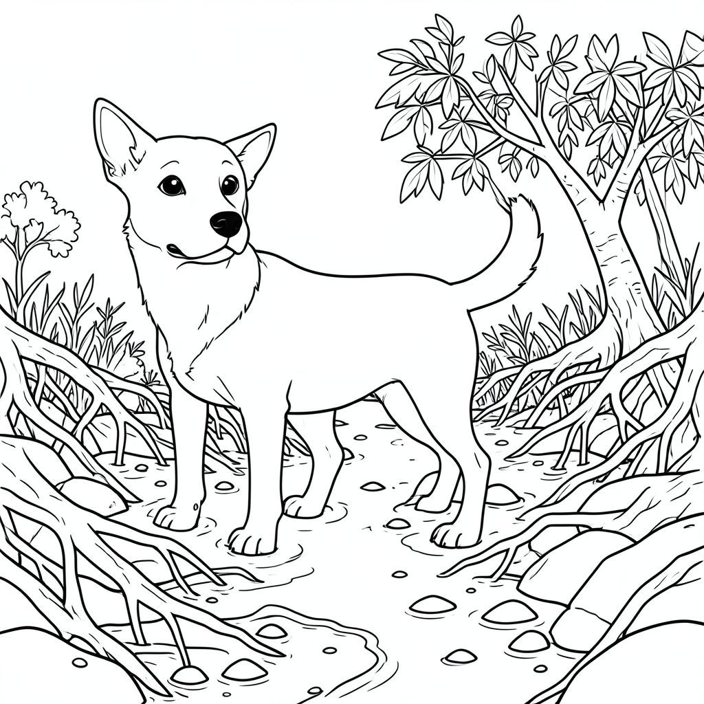 solo, chủ đề đơn, một đầu, hai mắt, hai tai, bốn chân, một đuôi, tỷ lệ tự nhiên, quy mô thích hợp trong môi trường, đúng giải phẫu, chó, Rừng ngập mặn, bờ biển, ngập lụt, kênh thủy triều, rễ, rối, ướt, đá, cát, bờ biển, trang màu, nghệ thuật đường, nền trắng, solo, chủ đề đơn, chính xác về mặt giải phẫu, giải phẫu hoàn hảo