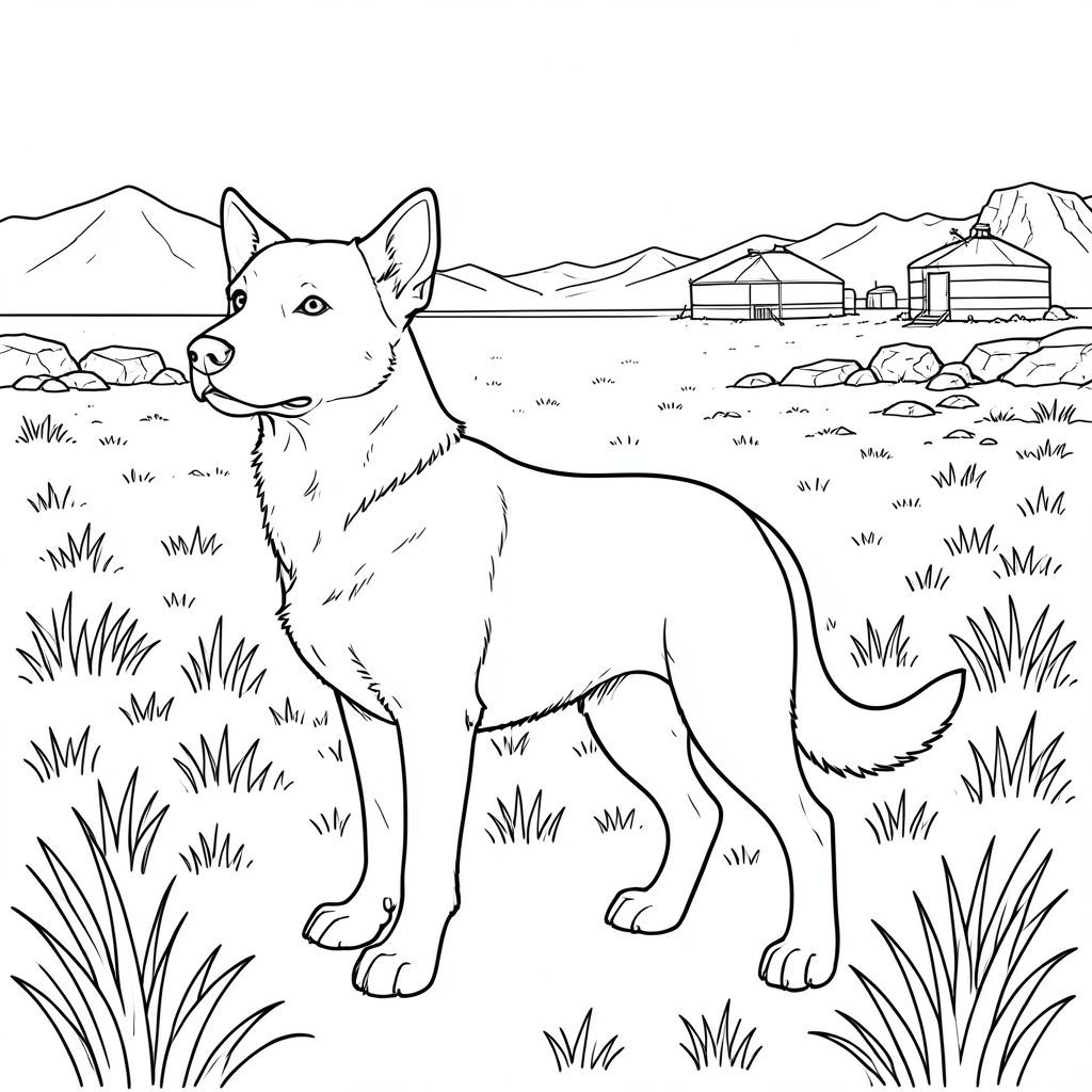solo, chủ đề đơn, một đầu, hai mắt, hai tai, bốn chân, một đuôi, tỷ lệ tự nhiên, quy mô thích hợp trong môi trường, đúng giải phẫu, chó, thảo nguyên, cỏ rộng lớn, cánh đồng vô tận, làng lều xa, chạng vạng, đường chân trời, núi, sự hình thành đá, đá phong hóa, đất khô, trang màu, nghệ thuật đường nét, nền trắng, solo, chủ đề đơn, đúng giải phẫu, giải phẫu hoàn hảo