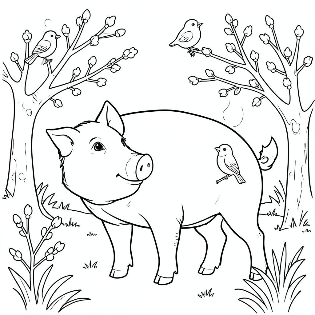solo, chủ đề đơn, một đầu, hai mắt, hai tai, bốn chân, một đuôi, tỷ lệ tự nhiên, quy mô thích hợp trong môi trường, đúng giải phẫu, Con lợn, ánh sáng mặt trời ấm áp, mùa xuân, chim, trở lại, chồi, cây cối, nền đơn giản, sạch sẽ, tinh khiết, đơn giản, trang màu, nghệ thuật đường, nền trắng, solo, chủ đề đơn, đúng giải phẫu, giải phẫu hoàn hảo
