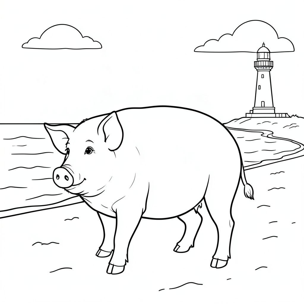 solo, chủ đề đơn, một đầu, hai mắt, hai tai, bốn chân, một đuôi, tỷ lệ tự nhiên, quy mô thích hợp trong môi trường, đúng giải phẫu, Con lợn, bãi biển, cát, đại dương, Bầu trời, ngọn hải đăng, xa, rõ ràng, điềm tĩnh, yên bình, đơn giản, trang màu, nghệ thuật đường nét, nền trắng, solo, chủ đề đơn, đúng về mặt giải phẫu, giải phẫu hoàn hảo