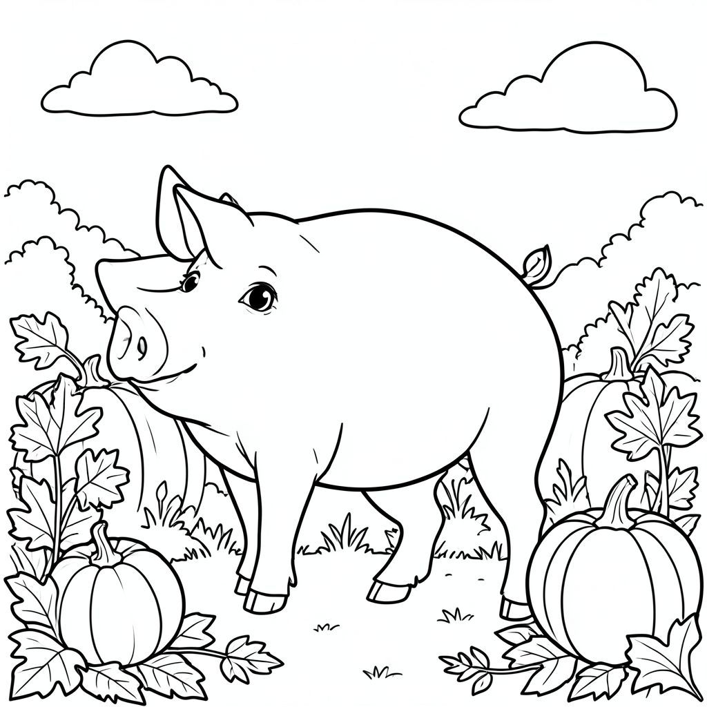 solo, chủ đề đơn, một đầu, hai mắt, hai tai, bốn chân, một đuôi, tỷ lệ tự nhiên, quy mô thích hợp trong môi trường, đúng giải phẫu, Con lợn, Bản vá bí ngô, mùa thu, buổi sáng, bầu, lá, ánh sáng mặt trời, bầu trời quang đãng, nền đơn giản, sạch sẽ, tuyến tính, trang màu, nghệ thuật đường nét, nền trắng, solo, chủ đề đơn, đúng giải phẫu, giải phẫu hoàn hảo