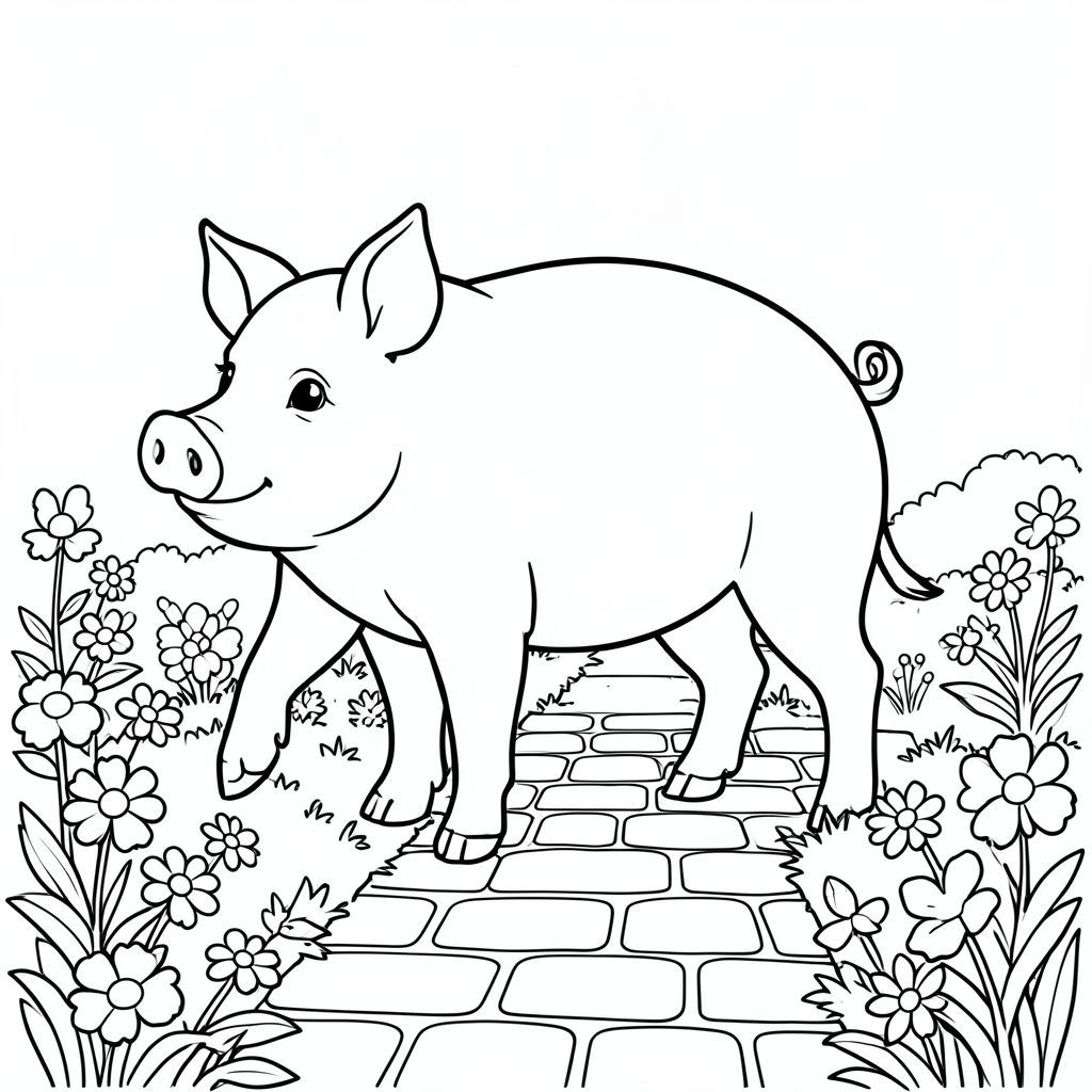 solo, chủ đề đơn, một đầu, hai mắt, hai tai, bốn chân, một đuôi, tỷ lệ tự nhiên, quy mô thích hợp trong môi trường, đúng giải phẫu, Con lợn, đá cuội, con đường, vườn, hoa, giường, đơn giản, sạch sẽ, lý lịch, tuyến tính, nghệ thuật, tô màu, nghệ thuật đường, nền trắng, solo, chủ đề đơn, đúng về mặt giải phẫu, giải phẫu hoàn hảo