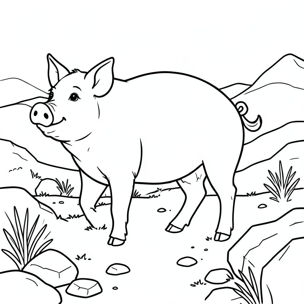 solo, chủ đề đơn, một đầu, hai mắt, hai tai, bốn chân, một đuôi, tỷ lệ tự nhiên, quy mô thích hợp trong môi trường, đúng giải phẫu, Con lợn, đá, sa mạc, đường mòn, đá, bàn chải khô, đơn giản, dọn dẹp, lý lịch, phong cảnh, đường chân trời, trang màu, nghệ thuật đường, nền trắng, solo, chủ đề đơn, đúng về mặt giải phẫu, giải phẫu hoàn hảo