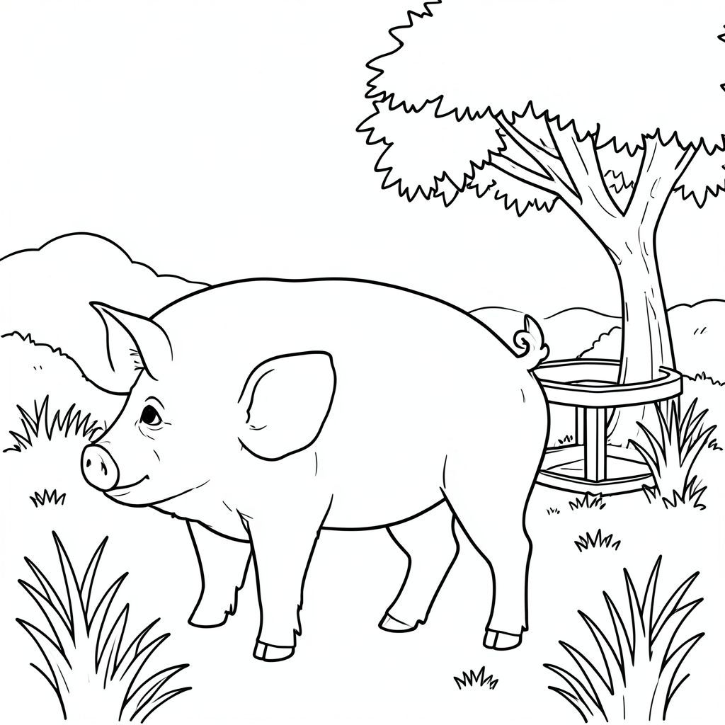 solo, chủ đề đơn, một đầu, hai mắt, hai tai, bốn chân, một đuôi, tỷ lệ tự nhiên, quy mô thích hợp trong môi trường, đúng giải phẫu, Con lợn, Đồng cỏ, cỏ, máng nước, cây bóng mát, Ánh sáng mặt trời, đơn giản, sạch sẽ, lý lịch, tuyến tính, thuần khiết, trang màu, nghệ thuật đường, nền trắng, solo, chủ đề đơn, đúng về mặt giải phẫu, giải phẫu hoàn hảo
