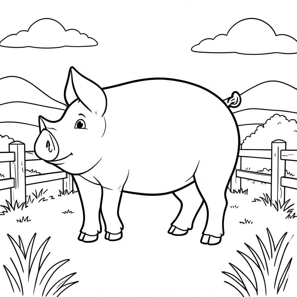 solo, chủ đề đơn, một đầu, hai mắt, hai tai, bốn chân, một đuôi, tỷ lệ tự nhiên, quy mô thích hợp trong môi trường, đúng giải phẫu, con lợn, đường nông thôn, hàng rào gỗ, đồng cỏ, nền đơn giản, dọn dẹp, đơn giản, tuyến tính, cánh đồng, nông thôn, hòa bình, tô màu, nghệ thuật đường, nền trắng, solo, chủ đề đơn, đúng giải phẫu, giải phẫu hoàn hảo