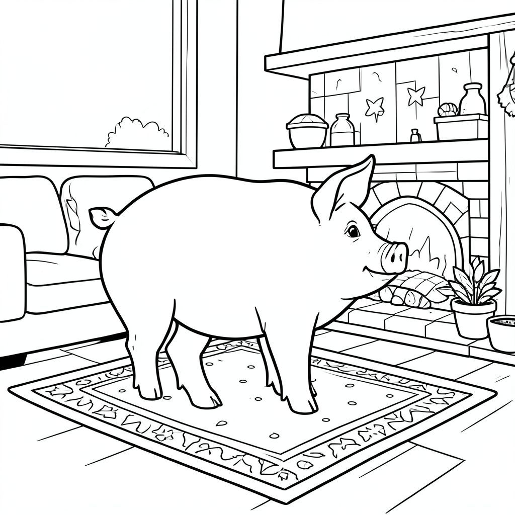 solo, chủ đề đơn, một đầu, hai mắt, hai tai, bốn chân, một đuôi, tỷ lệ tự nhiên, quy mô thích hợp trong môi trường, đúng giải phẫu, con lợn, lò sưởi, thảm, gỗ, đơn giản, sạch sẽ, ấm cúng, phòng khách, có hoa văn, truyện tranh, nghệ thuật đại chúng, trang màu, nghệ thuật đường, nền trắng, solo, chủ đề đơn, đúng giải phẫu, giải phẫu hoàn hảo