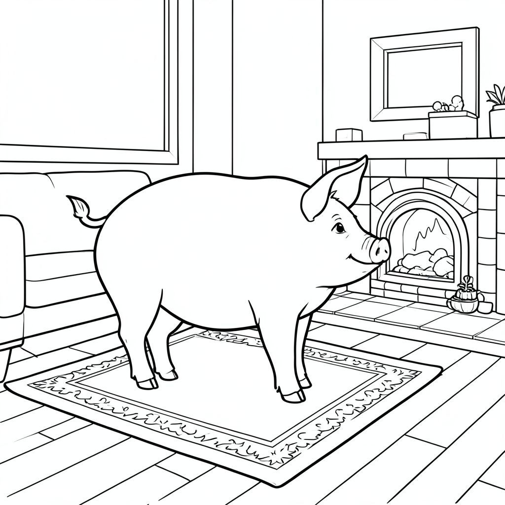 solo, chủ đề đơn, một đầu, hai mắt, hai tai, bốn chân, một đuôi, tỷ lệ tự nhiên, quy mô thích hợp trong môi trường, đúng giải phẫu, con lợn, lò sưởi, thảm, sàn gỗ, ấm cúng, ấm áp, đơn giản, dọn dẹp, nội thất, phòng khách, mẫu, trang màu, nghệ thuật đường, nền trắng, solo, chủ đề đơn, đúng giải phẫu, giải phẫu hoàn hảo