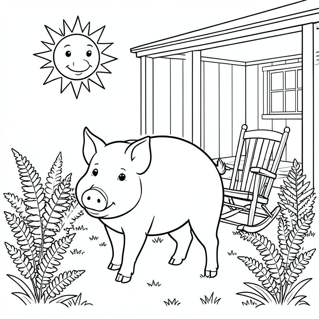 solo, chủ đề đơn, một đầu, hai mắt, hai tai, bốn chân, một đuôi, tỷ lệ tự nhiên, quy mô thích hợp trong môi trường, đúng giải phẫu, Con lợn, mặt trời, hiên nhà, ghế bập bênh, dương xỉ, vườn, đơn giản, lý lịch, dọn dẹp, nội thất trắng, cỏ, trang tô màu, nghệ thuật đường, nền trắng, solo, chủ đề đơn, đúng giải phẫu, giải phẫu hoàn hảo