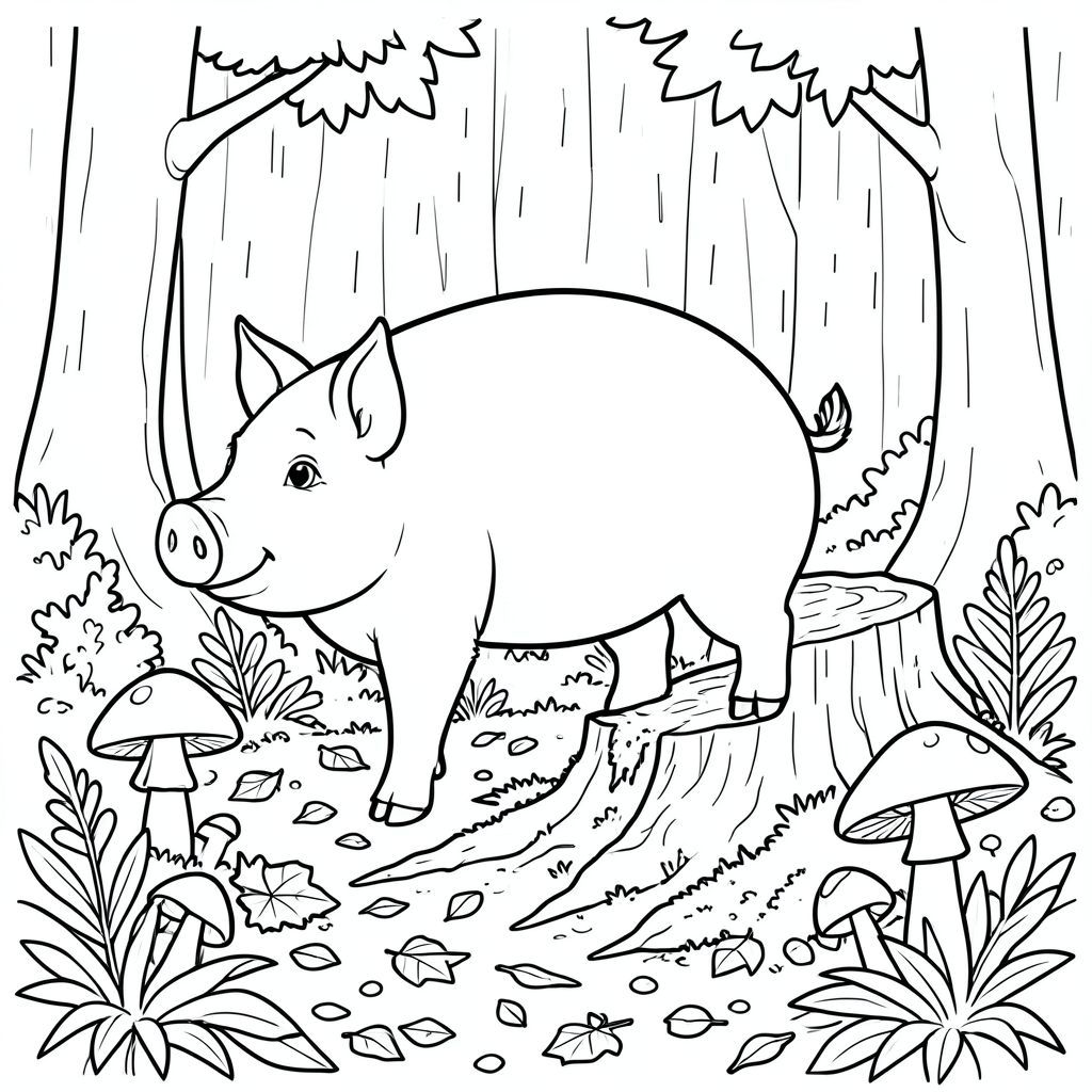 solo, chủ đề đơn, một đầu, hai mắt, hai tai, bốn chân, một đuôi, tỷ lệ tự nhiên, quy mô thích hợp trong môi trường, đúng giải phẫu, con lợn, nấm, rừng ẩm, gốc cây mục nát, rừng mùa thu, tán lá, mưa, rêu, rác lá, nền đơn giản, nghệ thuật tuyến tính, trang màu, nghệ thuật đường, nền trắng, solo, chủ đề đơn, đúng giải phẫu, giải phẫu hoàn hảo
