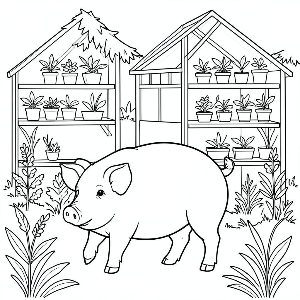 solo, chủ đề đơn, một đầu, hai mắt, hai tai, bốn chân, một đuôi, tỷ lệ tự nhiên, quy mô thích hợp trong môi trường, đúng giải phẫu, Con lợn, Nhà kính, kệ, cây con, Bằng gỗ, đơn giản, sạch sẽ, lý lịch, Tán lá, thực vật, nhỏ, trang màu, nghệ thuật đường, nền trắng, solo, chủ đề đơn, đúng về mặt giải phẫu, giải phẫu hoàn hảo
