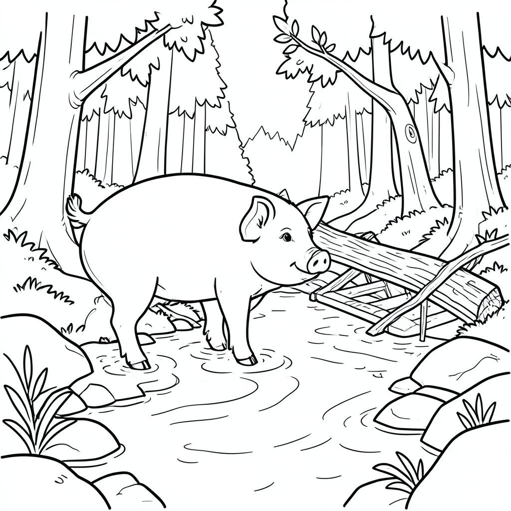 solo, chủ đề đơn, một đầu, hai mắt, hai tai, bốn chân, một đuôi, tỷ lệ tự nhiên, quy mô thích hợp trong môi trường, đúng giải phẫu, Con lợn, Suối, Nước, cầu, cây đổ, rừng, đá, ánh sáng mặt trời, rõ ràng, mịn, ướt, trang màu, nghệ thuật đường, nền trắng, solo, chủ đề đơn, đúng về mặt giải phẫu, giải phẫu hoàn hảo