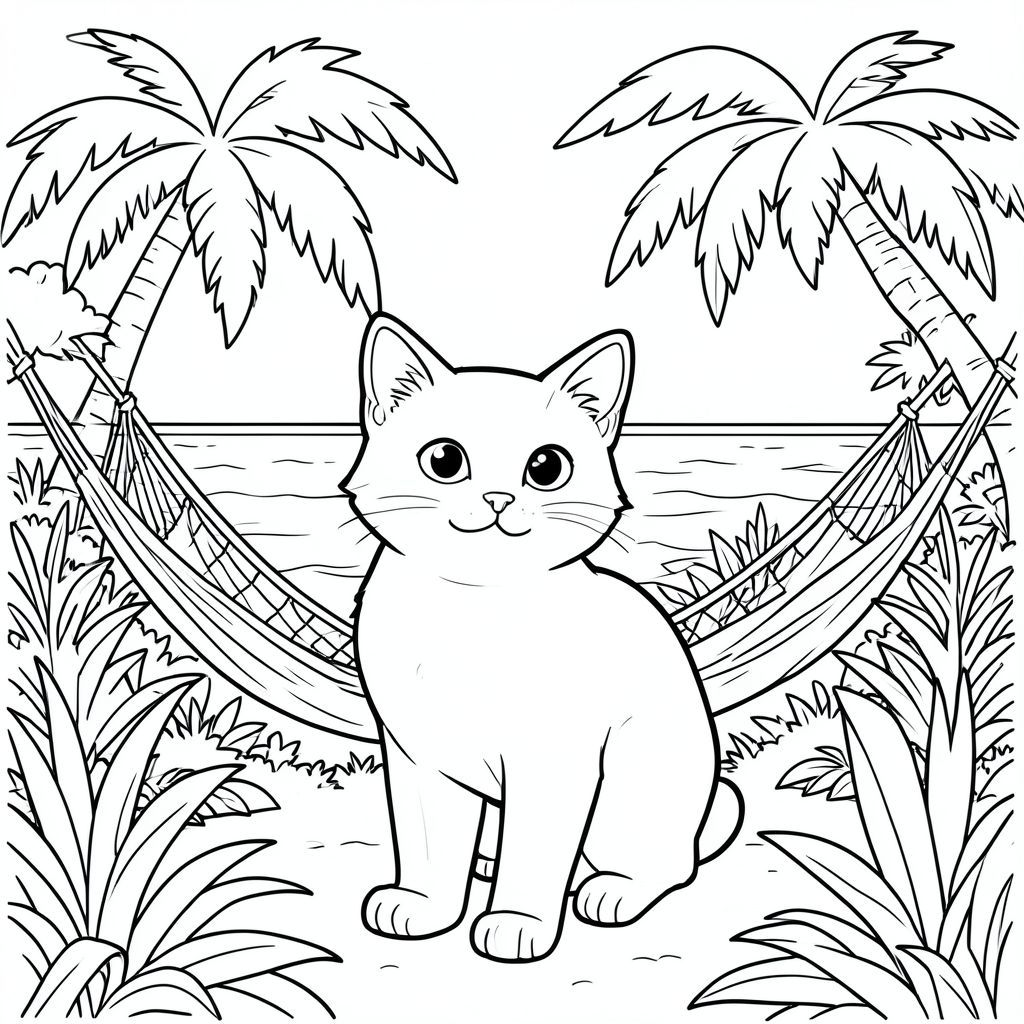 solo, chủ đề đơn, một đầu, hai mắt, hai tai, bốn chân, một đuôi, tỷ lệ tự nhiên, quy mô thích hợp trong môi trường, đúng giải phẫu, con mèo, biển, cây cọ, võng, pha lê rõ ràng, nhiệt đới, dày đặc, thảm thực vật, ánh sáng mặt trời, đại dương, lý lịch, trang màu, nghệ thuật đường, nền trắng, solo, chủ đề đơn, đúng giải phẫu, giải phẫu hoàn hảo