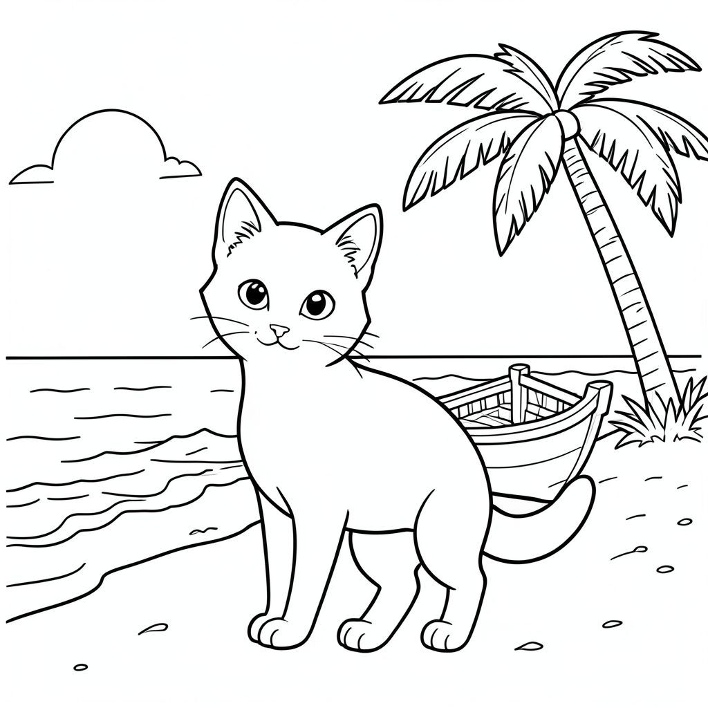 solo, chủ đề đơn, một đầu, hai mắt, hai tai, bốn chân, một đuôi, tỷ lệ tự nhiên, quy mô thích hợp trong môi trường, đúng giải phẫu, con mèo, bờ biển, cọ dừa, thuyền nhỏ, cát, đại dương, bầu trời quang đãng, ánh sáng mặt trời, sóng, bờ biển, Nước, trang tô màu, nghệ thuật đường, nền trắng, solo, chủ đề đơn, đúng về mặt giải phẫu, giải phẫu hoàn hảo
