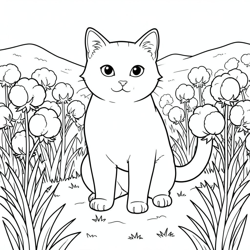 solo, chủ đề đơn, một đầu, hai mắt, hai tai, bốn chân, một đuôi, tỷ lệ tự nhiên, quy mô thích hợp trong môi trường, đúng giải phẫu, con mèo, Cánh đồng bông, quả bông mịn, trắng, mở rộng, rộng lớn, thanh thản, điềm tĩnh, kết cấu, cỏ, nhấp nhô, trang màu, nghệ thuật đường nét, nền trắng, solo, chủ đề đơn, đúng giải phẫu, giải phẫu hoàn hảo