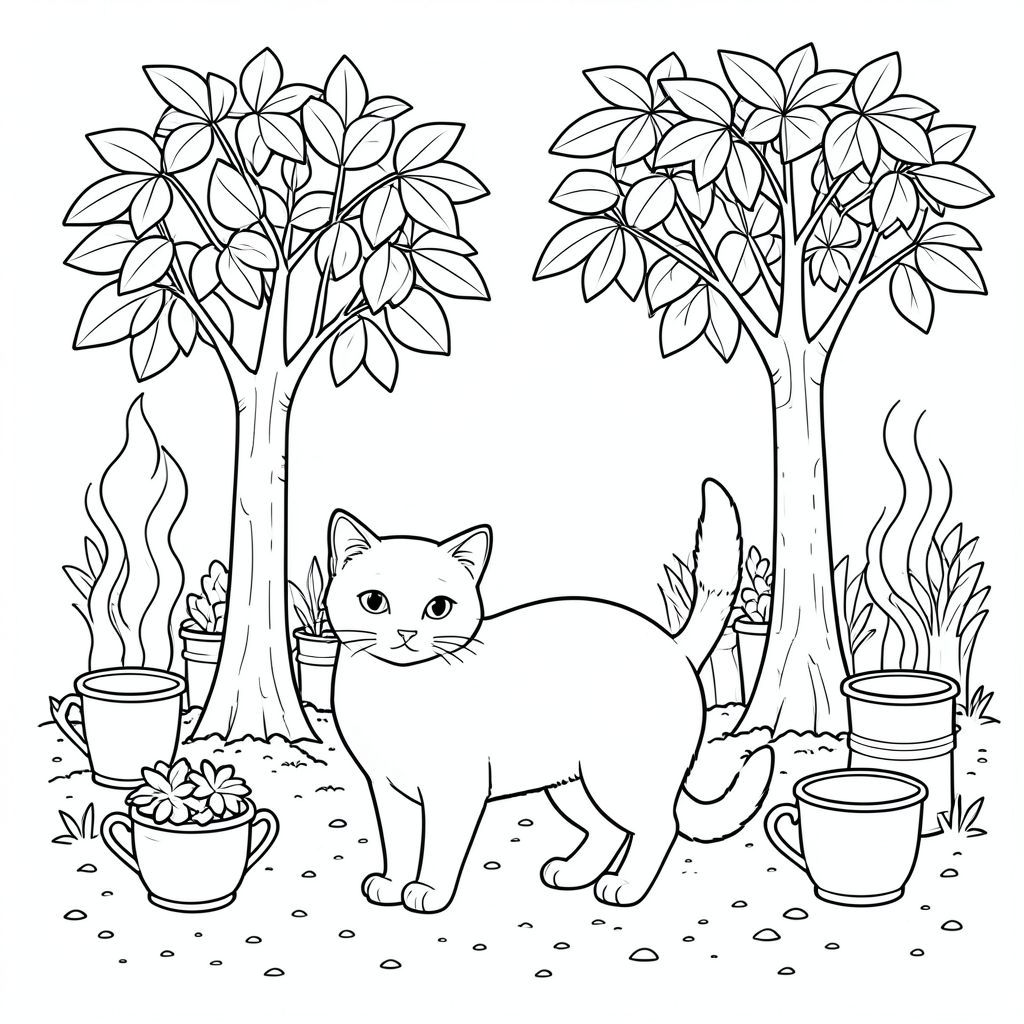 solo, chủ đề đơn, một đầu, hai mắt, hai tai, bốn chân, một đuôi, tỷ lệ tự nhiên, quy mô thích hợp trong môi trường, đúng giải phẫu, con mèo, Cây cao su, hàng, cốc sưu tập, thân cây, đất, kim loại, hơi nước, ánh sáng mặt trời, chi tiết, thực tế, trang tô màu, nghệ thuật đường, nền trắng, solo, chủ đề đơn, đúng về mặt giải phẫu, giải phẫu hoàn hảo