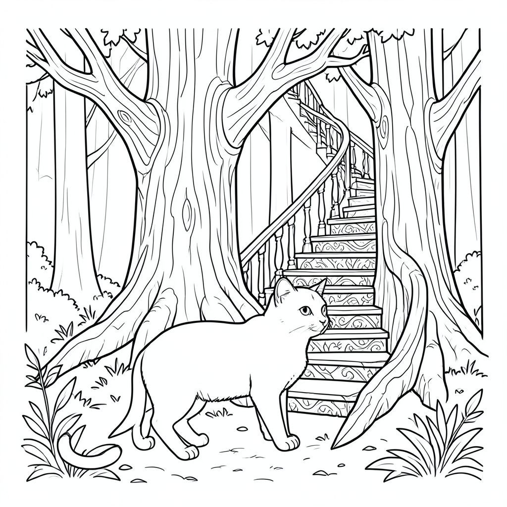 solo, chủ đề đơn, một đầu, hai mắt, hai tai, bốn chân, một đuôi, tỷ lệ tự nhiên, quy mô thích hợp trong môi trường, đúng giải phẫu, con mèo, cây cổ thụ, cầu thang xoắn ốc, chạm khắc, chi tiết, thực tế, môi trường, rừng, lớn, dọc, Gỗ, trang màu, nghệ thuật đường, nền trắng, solo, chủ đề đơn, chính xác về mặt giải phẫu, giải phẫu hoàn hảo
