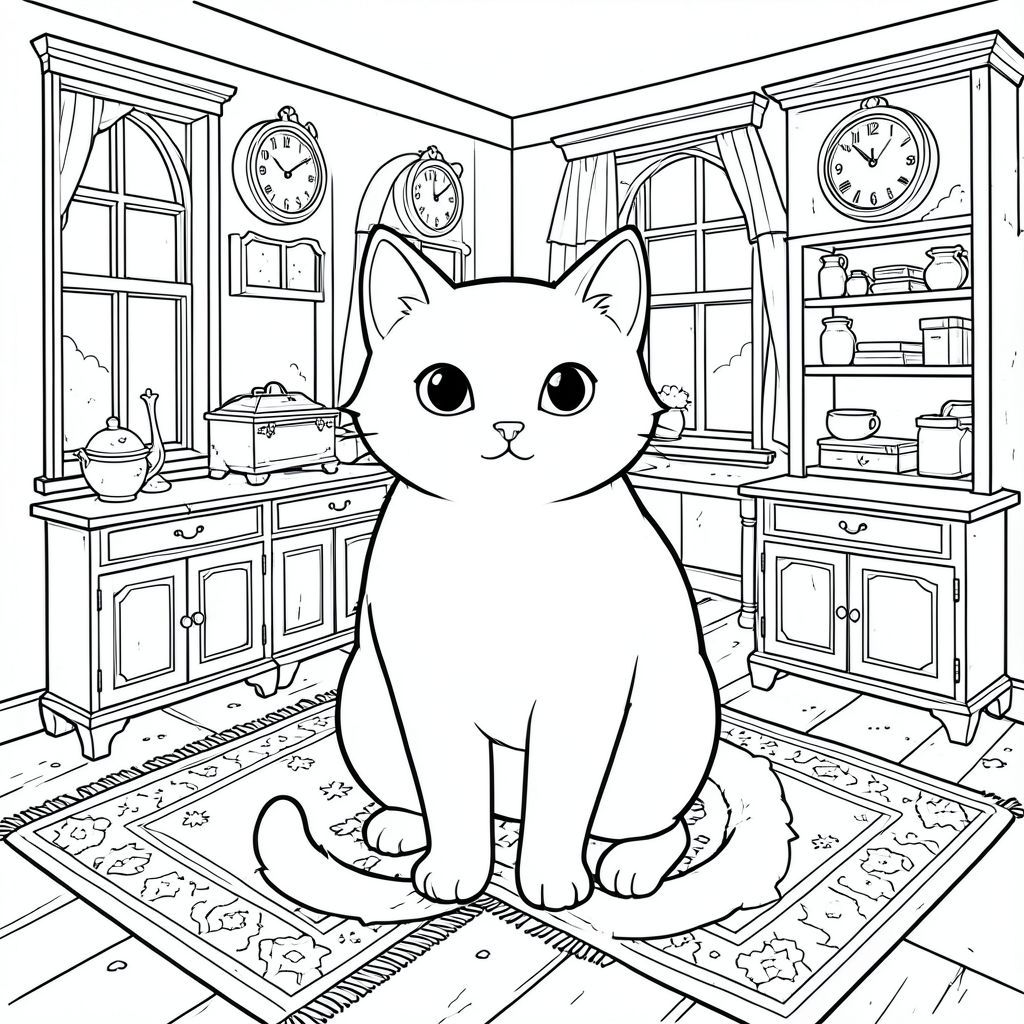 solo, chủ đề đơn, một đầu, hai mắt, hai tai, bốn chân, một đuôi, tỷ lệ tự nhiên, quy mô thích hợp trong môi trường, đúng giải phẫu, con mèo, Cửa hàng đồ cổ, Cửa sổ, đồng hồ, đồ nội thất, kệ, bụi, sàn gỗ, thảm, đồ cũ, cũ, trang màu, nghệ thuật đường, nền trắng, solo, chủ đề đơn, đúng về mặt giải phẫu, giải phẫu hoàn hảo