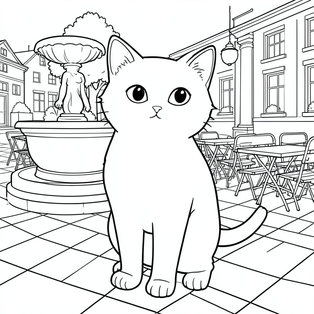 solo, chủ đề đơn, một đầu, hai mắt, hai tai, bốn chân, một đuôi, tỷ lệ tự nhiên, quy mô thích hợp trong môi trường, đúng giải phẫu, con mèo, Đài phun nước, quảng trường, bàn quán cà phê, ánh sáng mặt trời, dọn dẹp, đơn giản, lý lịch, Đô thị, Quảng trường, Vỉa hè, trang tô màu, nghệ thuật đường, nền trắng, solo, chủ đề đơn, đúng về mặt giải phẫu, giải phẫu hoàn hảo