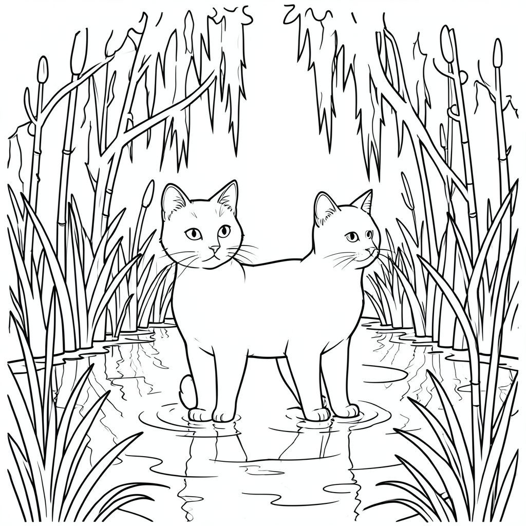 solo, chủ đề đơn, một đầu, hai mắt, hai tai, bốn chân, một đuôi, tỷ lệ tự nhiên, quy mô thích hợp trong môi trường, đúng giải phẫu, con mèo, đầm lầy cây bách, rêu Tây Ban Nha, nước, vẫn còn, phản chiếu, thảm thực vật rậm rạp, thân cây cao, nước, gợn sóng, ánh sáng mặt trời, trang màu, nghệ thuật đường nét, nền trắng, solo, chủ đề đơn, chính xác về mặt giải phẫu, giải phẫu hoàn hảo