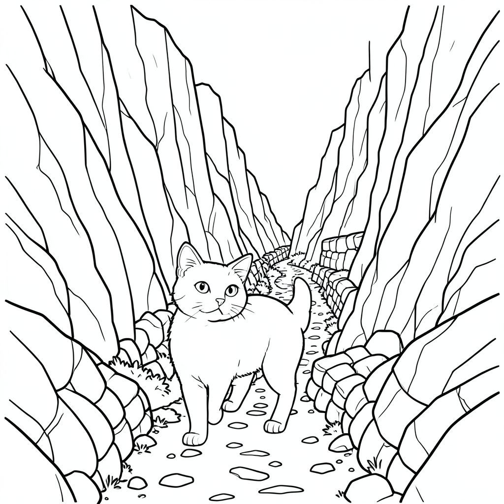solo, chủ đề đơn, một đầu, hai mắt, hai tai, bốn chân, một đuôi, tỷ lệ tự nhiên, quy mô thích hợp trong môi trường, đúng giải phẫu, con mèo, Dãy núi đá, vách đá dốc, đường mòn hẹp, phong cảnh hoang vắng, địa hình gồ ghề, mặt đá thẳng đứng, lối đi hẹp, con đường quanh co, tường đá, ánh sáng mặt trời, trang màu, nghệ thuật đường, nền trắng, solo, chủ đề đơn, đúng về mặt giải phẫu, giải phẫu hoàn hảo