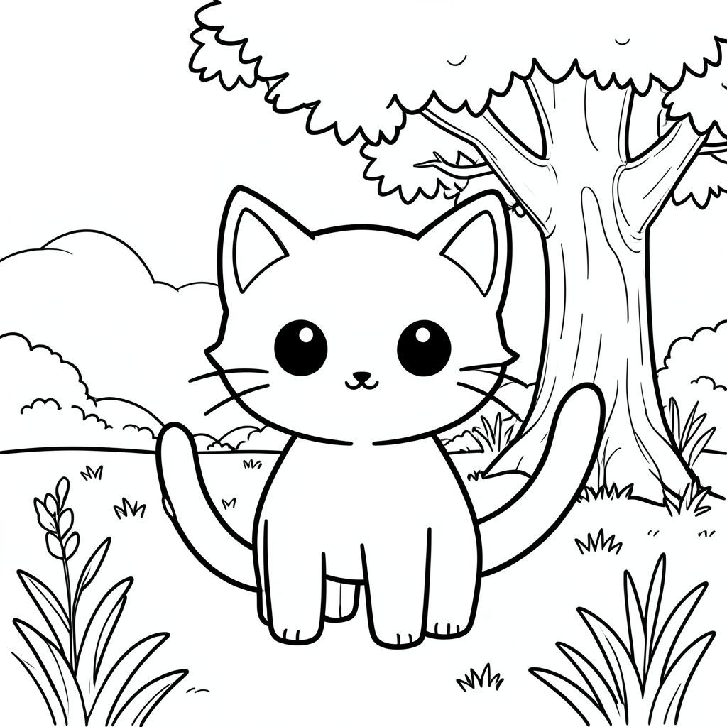 solo, chủ đề đơn, một đầu, hai mắt, hai tai, bốn chân, một đuôi, tỷ lệ tự nhiên, quy mô thích hợp trong môi trường, đúng giải phẫu, con mèo, đồng cỏ, cây sồi, bóng râm, ánh sáng mặt trời, nền đơn giản, dọn dẹp, thuần khiết, sách truyện, dễ thương, chibi, trang tô màu, nghệ thuật đường, nền trắng, solo, chủ đề đơn, đúng giải phẫu, giải phẫu hoàn hảo