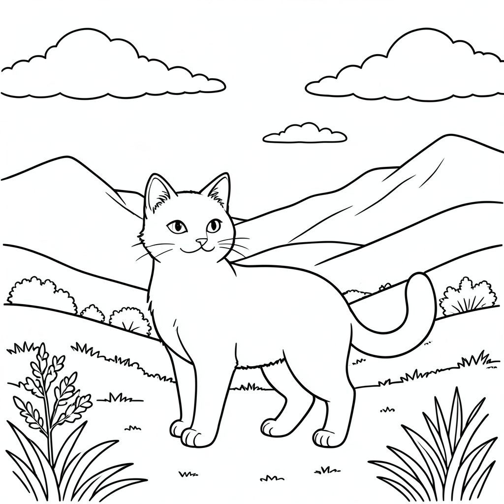 solo, chủ đề đơn, một đầu, hai mắt, hai tai, bốn chân, một đuôi, tỷ lệ tự nhiên, quy mô thích hợp trong môi trường, đúng giải phẫu, con mèo, Heather, đồi thoai thoải, sương mù, núi, đồng hoang, phong cảnh, bầu trời, đám mây, ánh sáng mặt trời, hình minh họa, trang màu, nghệ thuật đường, nền trắng, solo, chủ đề đơn, đúng về mặt giải phẫu, giải phẫu hoàn hảo