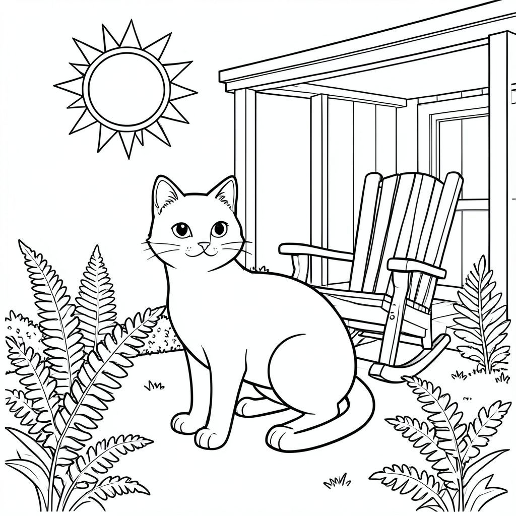 solo, chủ đề đơn, một đầu, hai mắt, hai tai, bốn chân, một đuôi, tỷ lệ tự nhiên, quy mô thích hợp trong môi trường, đúng giải phẫu, con mèo, mặt trời, hiên nhà, ghế bập bênh, dương xỉ, vườn, nắng, trong sáng, đơn giản, lý lịch, dọn dẹp, trang màu, nghệ thuật đường, nền trắng, solo, chủ đề đơn, đúng giải phẫu, giải phẫu hoàn hảo