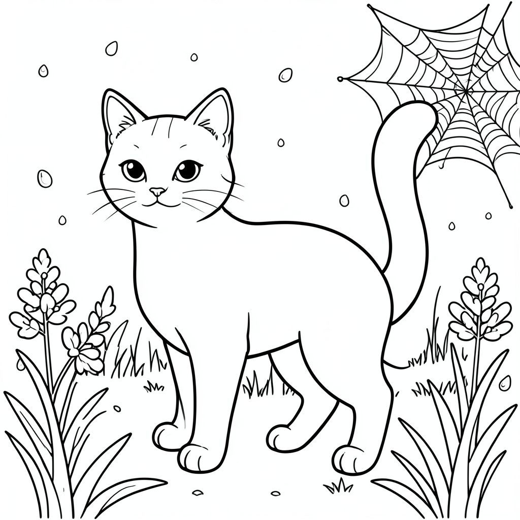solo, chủ đề đơn, một đầu, hai mắt, hai tai, bốn chân, một đuôi, tỷ lệ tự nhiên, quy mô thích hợp trong môi trường, đúng giải phẫu, con mèo, mùa xuân, buổi sáng, giọt sương, mạng nhện, cỏ, đơn giản, sạch sẽ, lý lịch, phong cảnh, tán lá, trang tô màu, nghệ thuật đường, nền trắng, solo, chủ đề đơn, đúng về mặt giải phẫu, giải phẫu hoàn hảo
