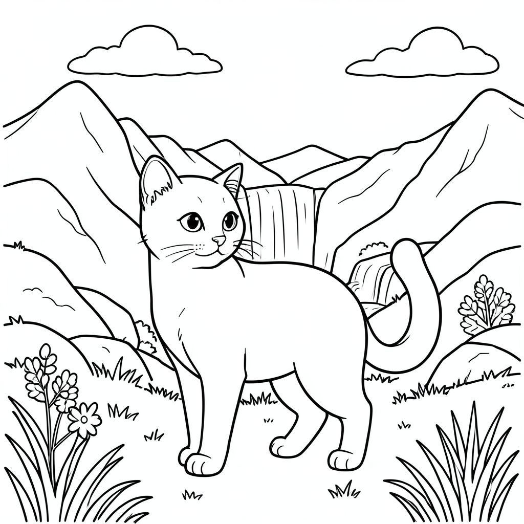 solo, chủ đề đơn, một đầu, hai mắt, hai tai, bốn chân, một đuôi, tỷ lệ tự nhiên, quy mô thích hợp trong môi trường, đúng giải phẫu, con mèo, núi, thác nước, đồng cỏ, ánh sáng mặt trời, rõ ràng, bầu trời, xa, mịn, đá, tô màu, nghệ thuật đường, nền trắng, solo, chủ đề đơn, đúng giải phẫu, giải phẫu hoàn hảo
