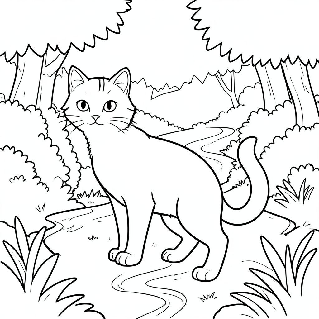 solo, chủ đề đơn, một đầu, hai mắt, hai tai, bốn chân, một đuôi, tỷ lệ tự nhiên, quy mô thích hợp trong môi trường, đúng giải phẫu, con mèo, rừng cây, suối, quanh co, bụi cây, đơn giản, sạch sẽ, lý lịch, phong cảnh, tán lá, ánh sáng mặt trời, trang màu, nghệ thuật đường, nền trắng, solo, chủ đề đơn, đúng về mặt giải phẫu, giải phẫu hoàn hảo
