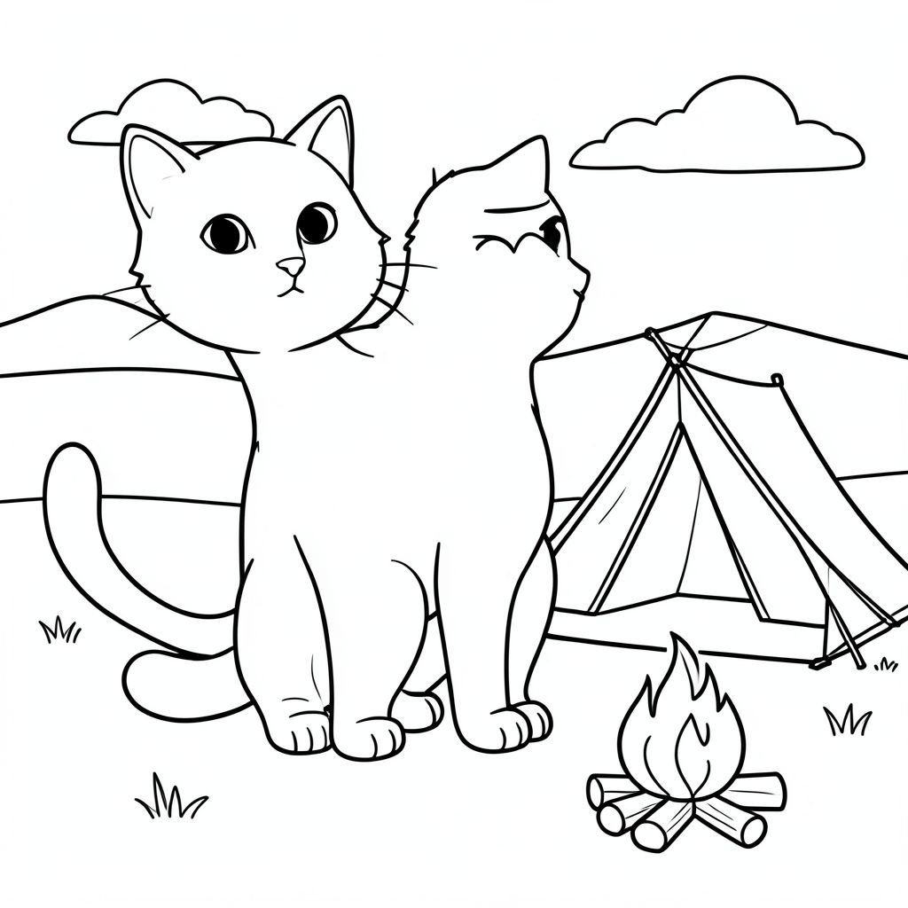solo, chủ đề đơn, một đầu, hai mắt, hai tai, bốn chân, một đuôi, tỷ lệ tự nhiên, quy mô thích hợp trong môi trường, đúng giải phẫu, con mèo, sa mạc, khu cắm trại, lều, lửa trại, nhẫn, đơn giản, dọn dẹp, phong cảnh, đường chân trời, bầu trời, trang màu, nghệ thuật đường, nền trắng, solo, chủ đề đơn, đúng về mặt giải phẫu, giải phẫu hoàn hảo