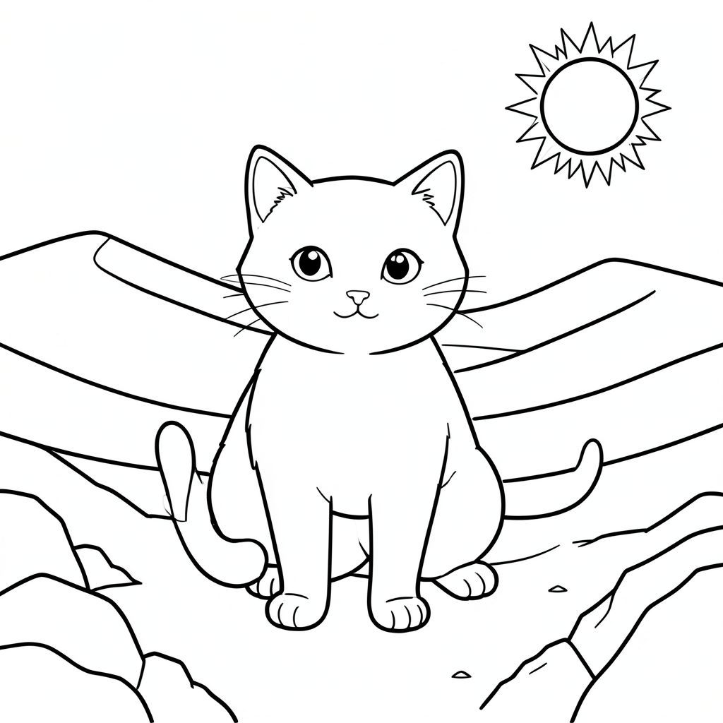 solo, chủ đề đơn, một đầu, hai mắt, hai tai, bốn chân, một đuôi, tỷ lệ tự nhiên, quy mô thích hợp trong môi trường, đúng giải phẫu, con mèo, sa mạc Sahara, rộng lớn, cồn cát, hình lưỡi liềm, cát, mở rộng, phong cảnh khô cằn, địa hình đá, mặt trời, nhiệt, trang màu, nghệ thuật đường, nền trắng, solo, chủ đề đơn, đúng giải phẫu, giải phẫu hoàn hảo
