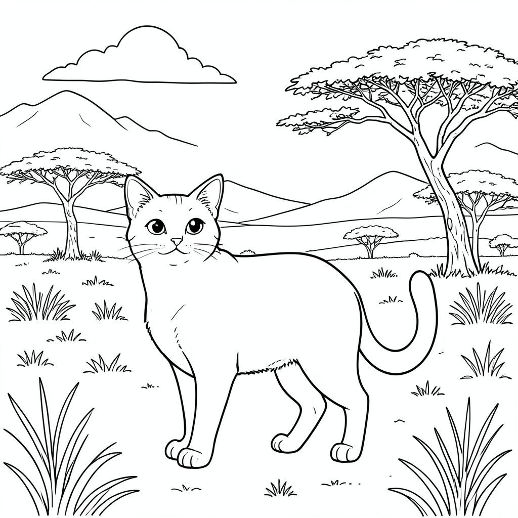solo, chủ đề đơn, một đầu, hai mắt, hai tai, bốn chân, một đuôi, tỷ lệ tự nhiên, quy mô thích hợp trong môi trường, đúng giải phẫu, con mèo, Savanna, đồng cỏ mở, cây keo, bầu trời, rộng lớn, ánh sáng mặt trời, những ngọn núi xa xôi, những ngọn đồi thoai thoải, thảm thực vật thưa thớt, bụi, trang màu, nghệ thuật đường, nền trắng, solo, chủ đề đơn, đúng về mặt giải phẫu, giải phẫu hoàn hảo