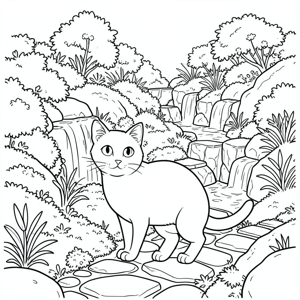 solo, chủ đề đơn, một đầu, hai mắt, hai tai, bốn chân, một đuôi, tỷ lệ tự nhiên, quy mô thích hợp trong môi trường, đúng giải phẫu, con mèo, Sườn đồi bậc thang, vườn Nhật Bản, thác nước, đường đá, thảm thực vật tươi tốt, rêu, đá, ánh sáng mặt trời, phản chiếu, đá mịn, trang màu, nghệ thuật đường, nền trắng, solo, chủ đề đơn, đúng giải phẫu, giải phẫu hoàn hảo