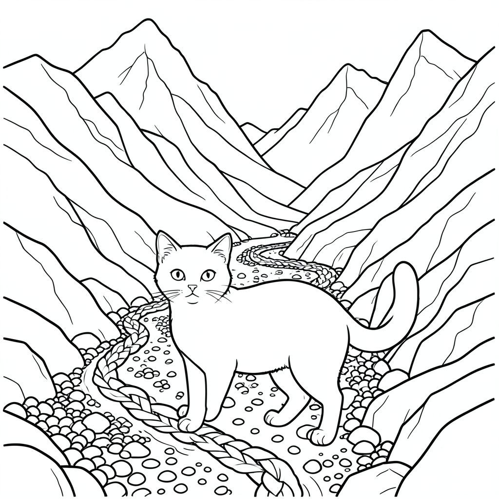 solo, chủ đề đơn, một đầu, hai mắt, hai tai, bốn chân, một đuôi, tỷ lệ tự nhiên, quy mô thích hợp trong môi trường, đúng giải phẫu, con mèo, Thung lũng, núi, sông băng, bện, sỏi, đá, dốc, dốc, ánh sáng mặt trời, chi tiết, trang màu, nghệ thuật đường, nền trắng, solo, chủ đề đơn, đúng về mặt giải phẫu, giải phẫu hoàn hảo