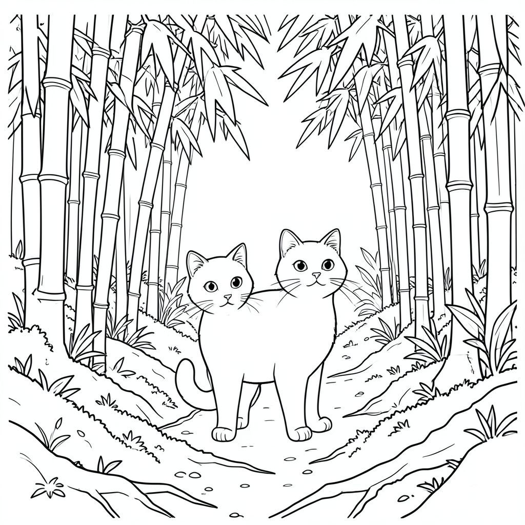 solo, chủ đề đơn, một đầu, hai mắt, hai tai, bốn chân, một đuôi, tỷ lệ tự nhiên, quy mô thích hợp trong môi trường, đúng giải phẫu, con mèo, tre rậm rạp, thân cây cao, ánh sáng mặt trời được lọc, tán lá dày, con đường quanh co, lốm đốm, sàn rừng, rêu, rễ, phối cảnh, trang màu, nghệ thuật đường, nền trắng, solo, chủ đề đơn, đúng giải phẫu, giải phẫu hoàn hảo