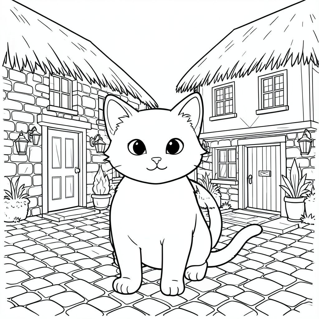 solo, chủ đề đơn, một đầu, hai mắt, hai tai, bốn chân, một đuôi, tỷ lệ tự nhiên, quy mô thích hợp trong môi trường, đúng giải phẫu, con mèo, Tường đá, làng, mái tranh, quán rượu cũ, đường lát đá cuội, Gỗ, Cửa sổ, Ô cửa, đèn lồng, lửa, trang tô màu, nghệ thuật đường, nền trắng, solo, chủ đề đơn, đúng về mặt giải phẫu, giải phẫu hoàn hảo