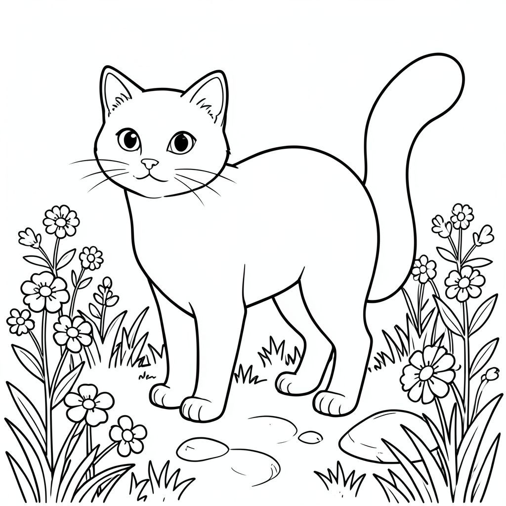 solo, chủ đề đơn, một đầu, hai mắt, hai tai, bốn chân, một đuôi, tỷ lệ tự nhiên, quy mô thích hợp trong môi trường, đúng giải phẫu, con mèo, vườn, hoa, hoa dại, nắng, cỏ, con đường, đá, nhỏ, đơn giản, lý lịch, trang tô màu, nghệ thuật đường, nền trắng, solo, chủ đề đơn, đúng về mặt giải phẫu, giải phẫu hoàn hảo