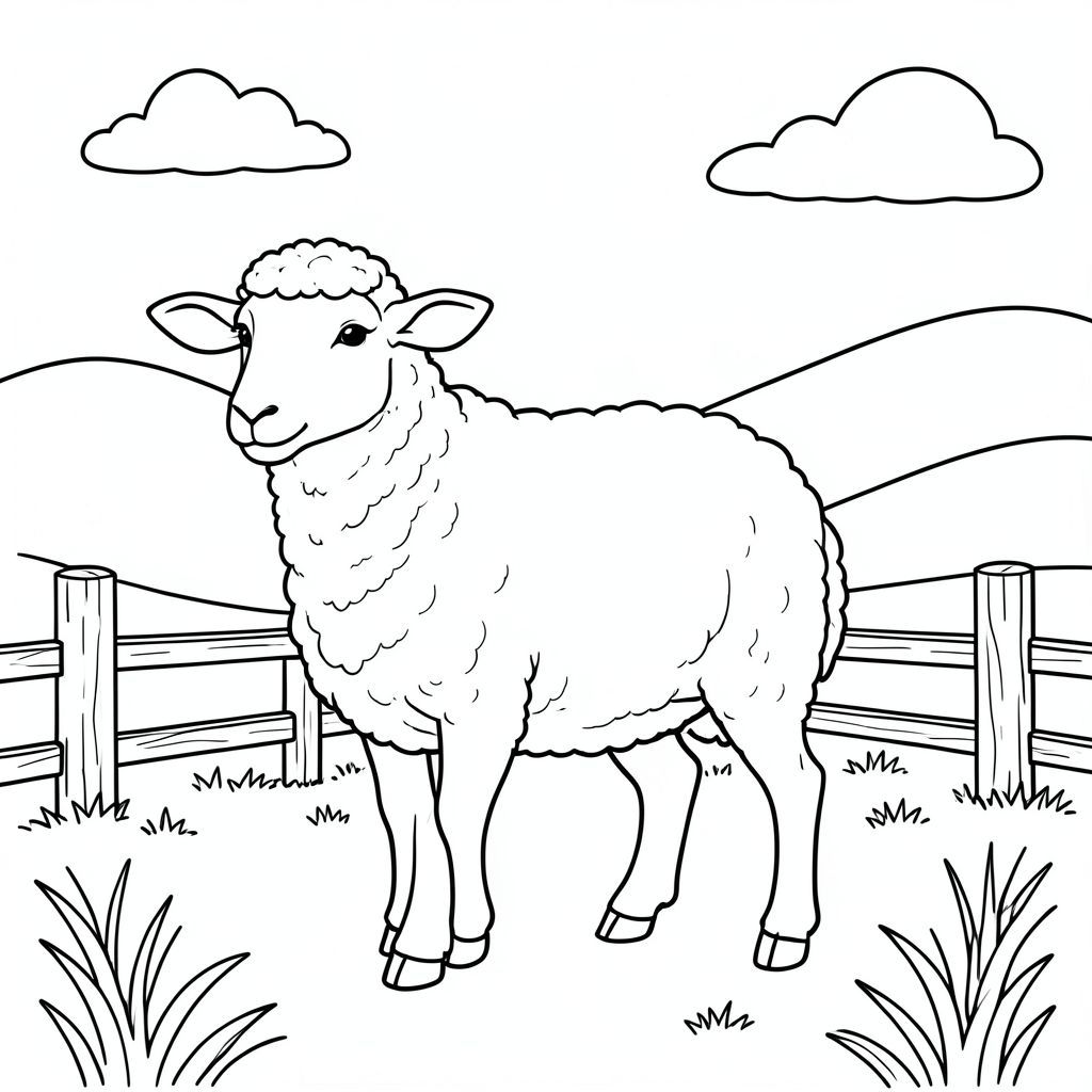 solo, chủ đề đơn, một đầu, hai mắt, hai tai, bốn chân, một đuôi, tỷ lệ tự nhiên, quy mô thích hợp trong môi trường, đúng giải phẫu, Cừu, đồng cỏ, đồi thoai thoải, hàng rào đơn giản, bài gỗ, bầu trời quang đãng, ánh sáng mặt trời, mềm mại, mộc mạc, yên bình, yên tĩnh, tô màu, nghệ thuật đường, nền trắng, solo, chủ đề đơn, đúng giải phẫu, giải phẫu hoàn hảo
