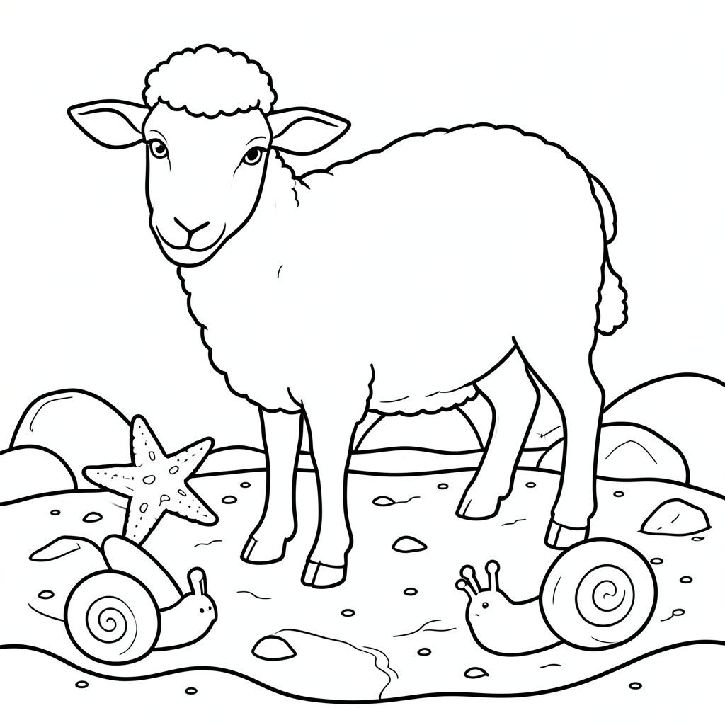 solo, chủ đề đơn, một đầu, hai mắt, hai tai, bốn chân, một đuôi, tỷ lệ tự nhiên, quy mô thích hợp trong môi trường, đúng giải phẫu, Cừu, Hồ thủy triều, sao biển, ốc sên, đá, cát, nước, rõ ràng, nông, nhỏ, đơn giản, tô màu, nghệ thuật đường, nền trắng, solo, chủ đề đơn, đúng giải phẫu, giải phẫu hoàn hảo