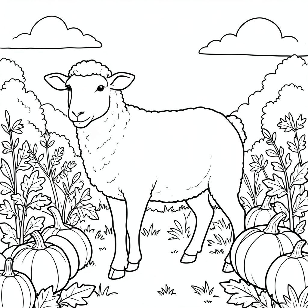 solo, chủ đề đơn, một đầu, hai mắt, hai tai, bốn chân, một đuôi, tỷ lệ tự nhiên, quy mô thích hợp trong môi trường, đúng giải phẫu, Cừu, Miếng vá bí ngô, mùa thu, buổi sáng, bầu, cánh đồng, tán lá, ánh sáng mặt trời, bầu trời quang đãng, nền đơn giản, dọn dẹp, trang tô màu, nghệ thuật đường, nền trắng, solo, chủ đề đơn, đúng giải phẫu, giải phẫu hoàn hảo