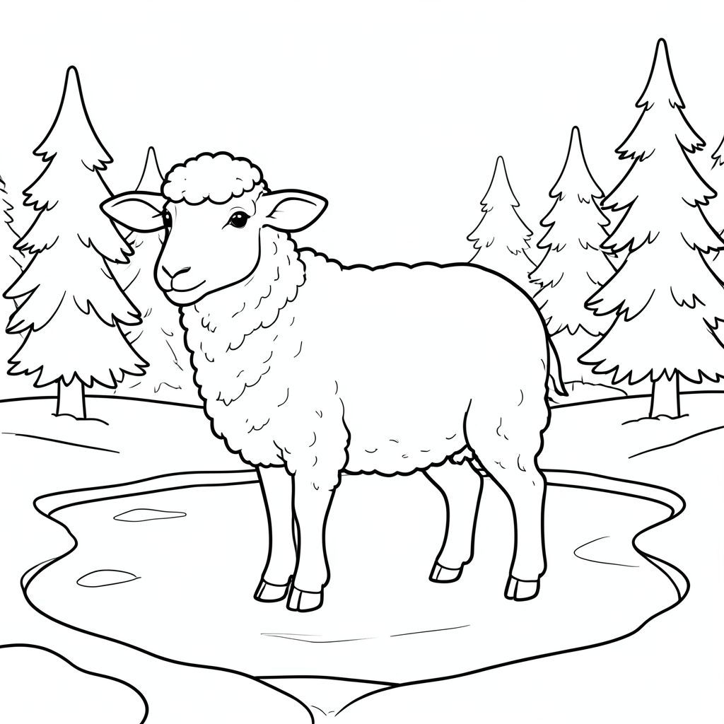 solo, chủ đề đơn, một đầu, hai mắt, hai tai, bốn chân, một đuôi, tỷ lệ tự nhiên, quy mô thích hợp trong môi trường, đúng giải phẫu, Cừu, Mùa đông, băng, ao, tuyết, thường xanh, cây cối, trắng, rõ ràng, thanh thản, điềm tĩnh, trang màu, nghệ thuật đường, nền trắng, solo, chủ đề đơn, đúng giải phẫu, giải phẫu hoàn hảo