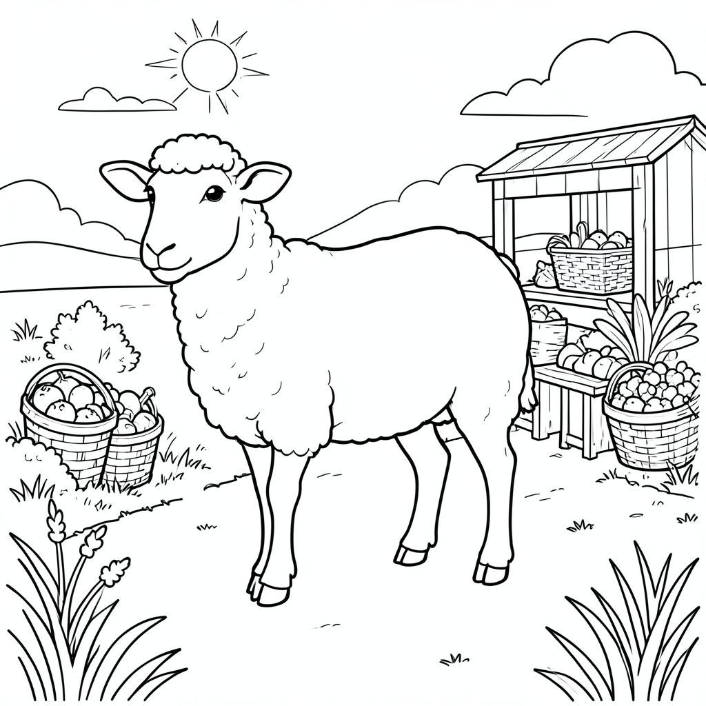 solo, chủ đề đơn, một đầu, hai mắt, hai tai, bốn chân, một đuôi, tỷ lệ tự nhiên, quy mô thích hợp trong môi trường, đúng giải phẫu, Cừu, Sản xuất đứng, đường nông thôn, rau, giỏ, nền đơn giản, dọn dẹp, nông thôn, phong cảnh, ánh sáng mặt trời, cỏ, trang tô màu, nghệ thuật đường, nền trắng, solo, chủ đề đơn, đúng giải phẫu, giải phẫu hoàn hảo