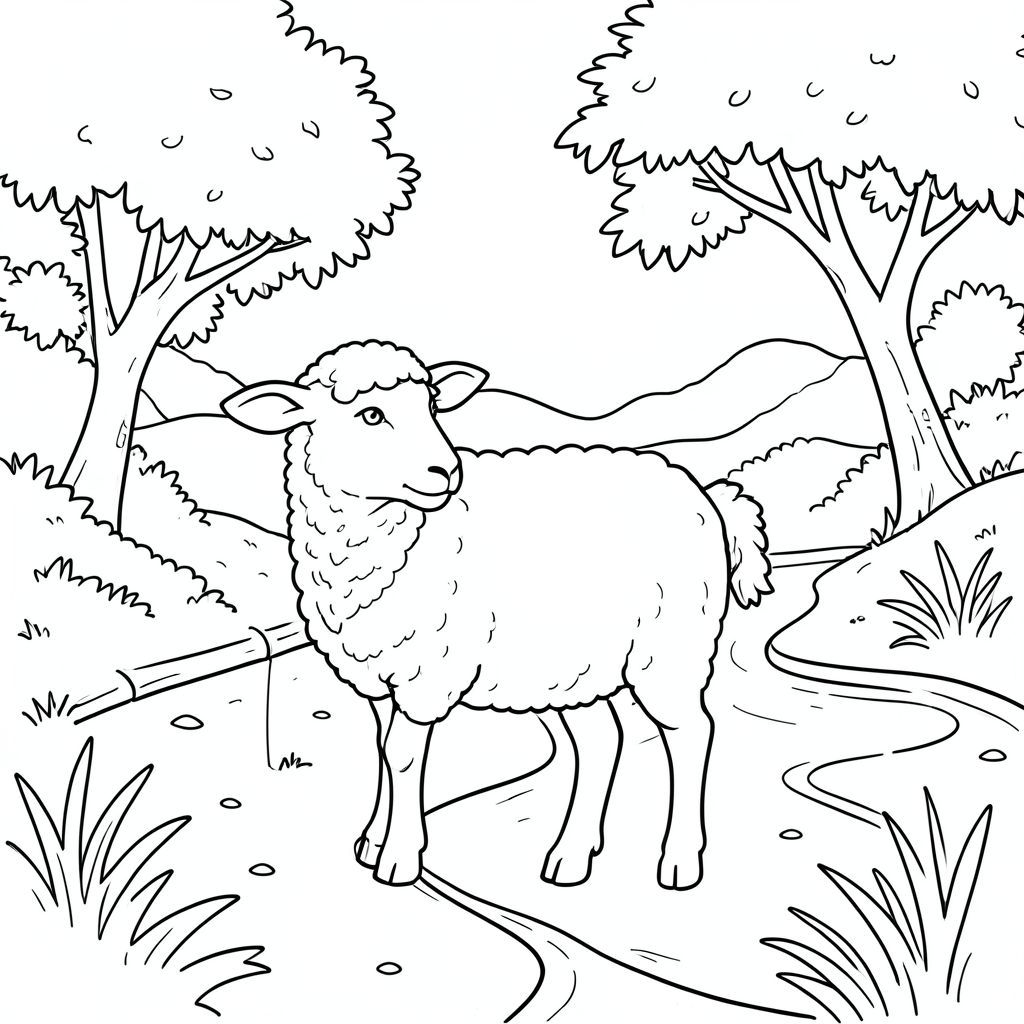 solo, chủ đề đơn, một đầu, hai mắt, hai tai, bốn chân, một đuôi, tỷ lệ tự nhiên, quy mô thích hợp trong môi trường, đúng giải phẫu, Cừu, Sông, uốn cong, cát, ngân hàng, cây, Tán lá, ánh sáng mặt trời, trong sáng, điềm tĩnh, yên bình, trang màu, nghệ thuật đường, nền trắng, solo, chủ đề đơn, đúng giải phẫu, giải phẫu hoàn hảo