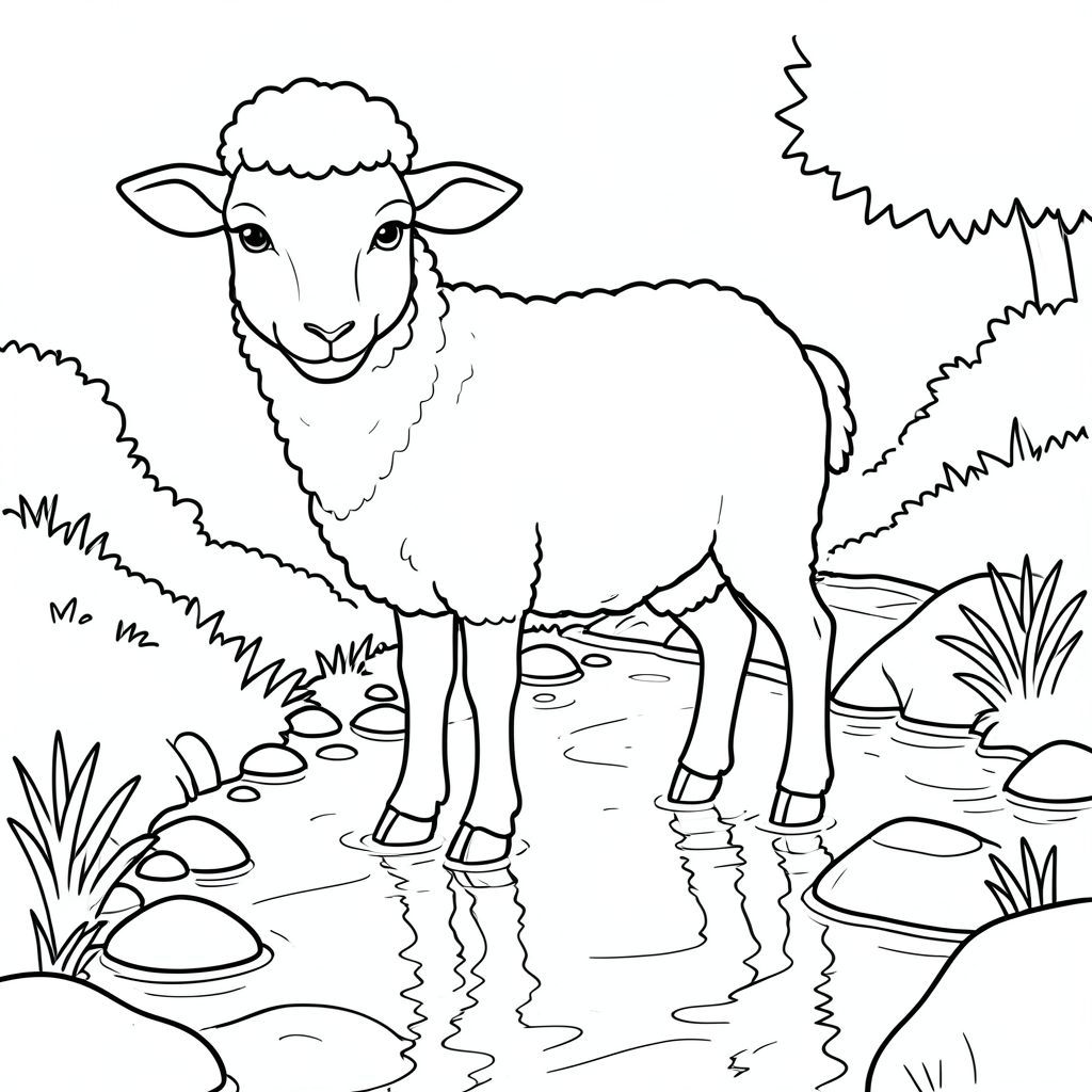 solo, chủ đề đơn, một đầu, hai mắt, hai tai, bốn chân, một đuôi, tỷ lệ tự nhiên, quy mô thích hợp trong môi trường, đúng giải phẫu, Cừu, Suối, đường đi, đá, nhẹ nhàng, nông, Nước, phản chiếu, rõ ràng, ánh sáng mặt trời, đơn giản, trang màu, nghệ thuật đường, nền trắng, solo, chủ đề đơn, đúng về mặt giải phẫu, giải phẫu hoàn hảo