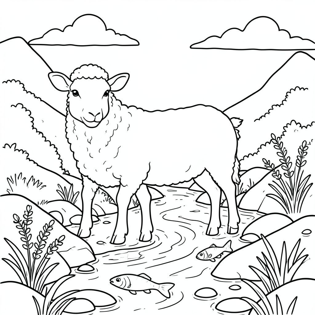 solo, chủ đề đơn, một đầu, hai mắt, hai tai, bốn chân, một đuôi, tỷ lệ tự nhiên, quy mô thích hợp trong môi trường, đúng giải phẫu, Cừu, Suối núi, cải xoong, Cá nhỏ, Nước trong, đá, Ánh sáng mặt trời, đá mịn, Bầu trời, Dòng chảy nhẹ nhàng, Nguyên sơ, Trang màu, Nghệ thuật đường nét, nền trắng, Solo, chủ đề đơn, Đúng giải phẫu, Giải phẫu hoàn hảo