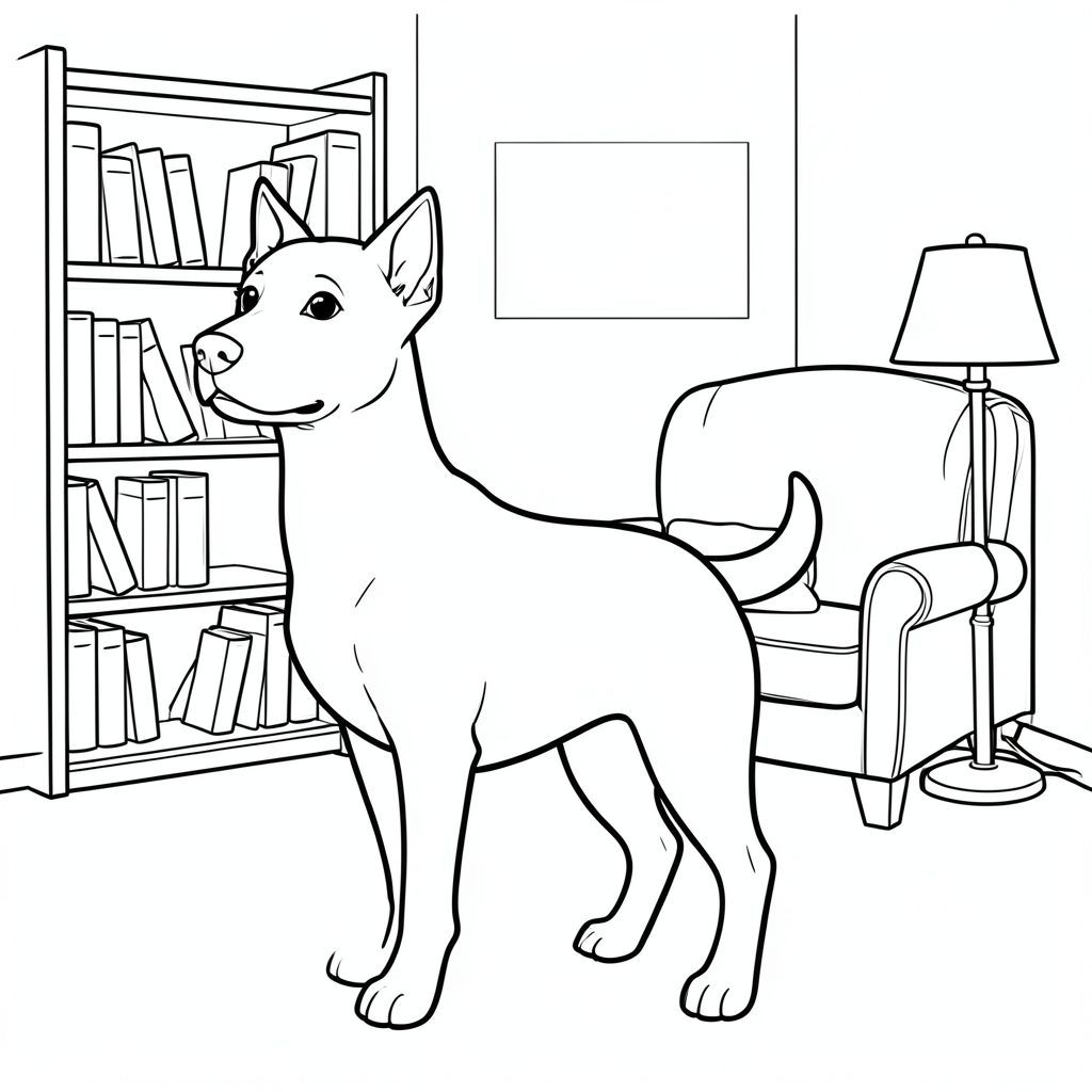 solo, chủ đề đơn, một đầu, hai mắt, hai tai, bốn chân, một đuôi, tỷ lệ tự nhiên, quy mô thích hợp trong môi trường, đúng giải phẫu,, giá sách, ghế bành, đèn, ấm cúng, Den, đơn giản, sạch sẽ, lý lịch, Vẽ tay, Sách truyện, trang tô màu, nghệ thuật đường nét, nền trắng, Solo, chủ đề đơn, đúng về mặt giải phẫu, giải phẫu hoàn hảo