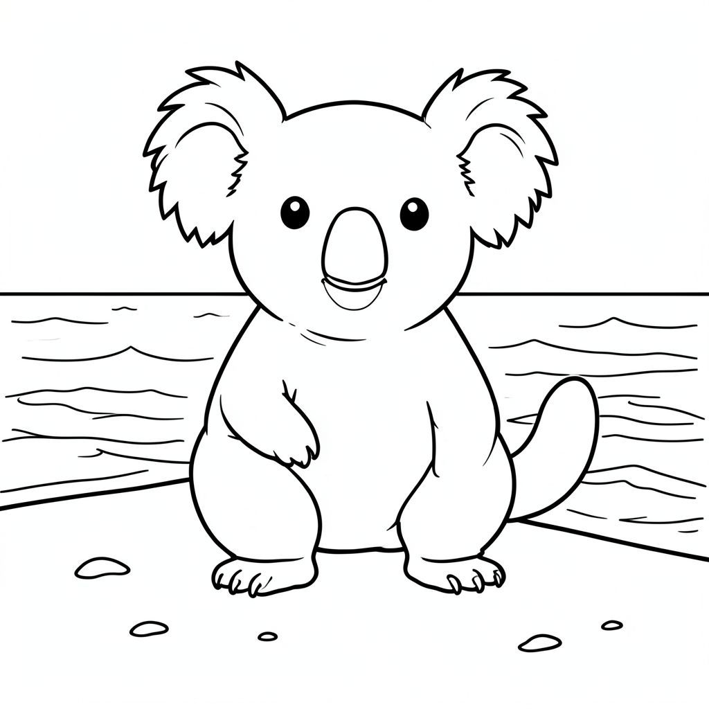 solo, chủ đề đơn, một đầu, hai mắt, hai tai, bốn chân, một đuôi, tỷ lệ tự nhiên, quy mô thích hợp trong môi trường, đúng giải phẫu, Koala, Bãi biển cát, cát, Nước, rõ ràng, ánh sáng mặt trời, ấm áp, nhẹ nhàng, sóng, bờ biển, nhỏ, trang màu, nghệ thuật đường, nền trắng, solo, chủ đề đơn, đúng về mặt giải phẫu, giải phẫu hoàn hảo