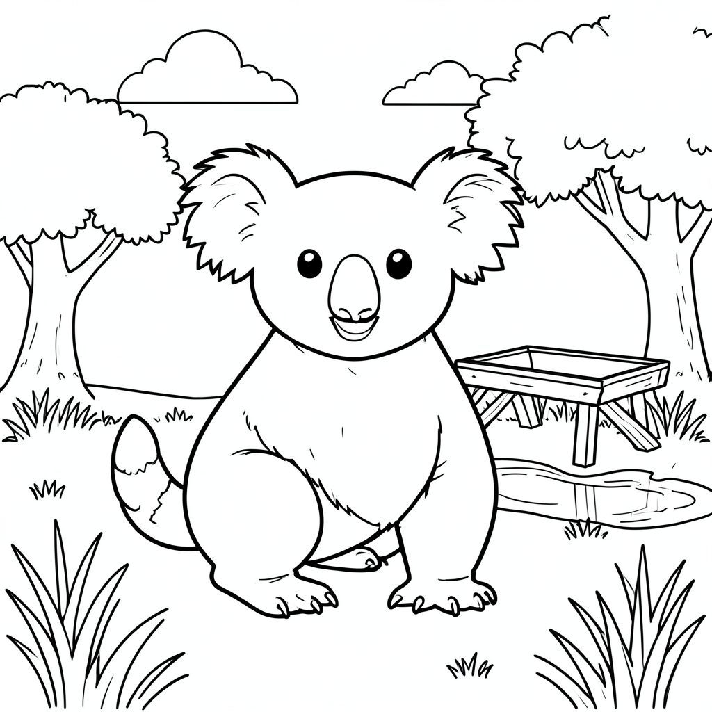 solo, chủ đề đơn, một đầu, hai mắt, hai tai, bốn chân, một đuôi, tỷ lệ tự nhiên, quy mô thích hợp trong môi trường, đúng giải phẫu, Koala, Đồng cỏ, cỏ, cây, bóng râm, máng, Nước, đơn giản, sạch sẽ, lý lịch, Bầu trời, trang màu, nghệ thuật đường, nền trắng, Solo, chủ đề đơn, đúng về mặt giải phẫu, giải phẫu hoàn hảo